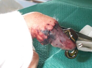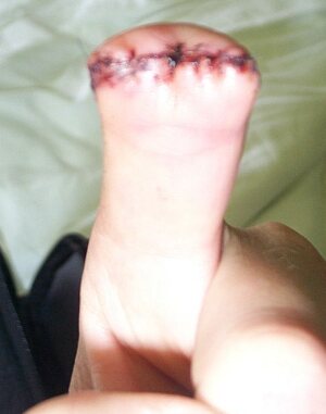 Nach 3 h OP in der BG-Unfallklinik war das Stück wieder dran: das Ergebnis war jedoch nicht ganz so berauschend