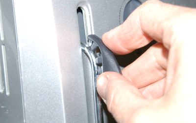 Die Plastikabdeckung nach vorne herausziehen. Bei manchen Modellen sieht die Abdeckung anders aus und ist von unten mit zwei Kreuzschlitz-Schrauben verschraubt. |