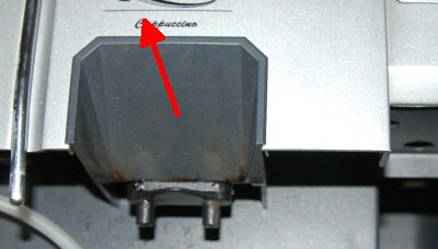 Das Gehäuse nach oben/vorne wegklappen, dabei auf das Dampfrohr und den Anschlusse für den Capuccinatoe (dieser kann weggedreht werden) achten |
