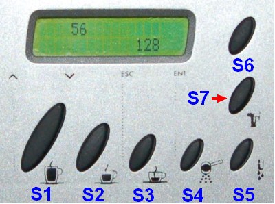 geschlossen sein. Die beiden Tasten Espresso S3 und Wasser S5 gleichzeitig drücken und dabei das Gerät einschalten. Erst nach dem Einschalten beide Tasten loslassen. Das Gerät müsste sich jetzt, nach dem die Softwareversion kurz angezeigt wurde, im Testmodus befinden: