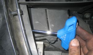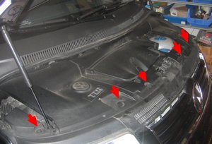 ohne Bild: Motorraumverkleidung unten ausbaue. Sechs Schrauben SW 13 |