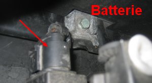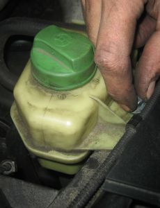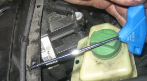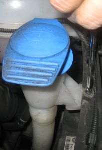 Kreuzschlitz-Schraube am Scheibenwasch-Einfüllstuten lösen und nach hinten klappen. |